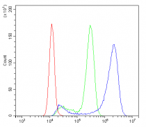 Flow Cytometry: A431 cells were blocked with 10% normal goat serum and then stained with ARG43268 anti-IQGAP1 antibody (blue) at 1 µg/10^6 cells for 30 min at 20°C, followed by incubation with DyLight®488 labelled secondary antibody. Isotype control antibody (green) was rabbit IgG (1 µg/10^6 cells) used under the same conditions. Unlabelled sample (red) was also used as a control.