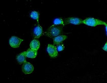 Immunofluorescence: A431 cells stained with ARG43268 anti-IQGAP1 antibody (green) at 2 µg/ml dilution, overnight at 4°C. DAPI (blue) for nuclear staining.