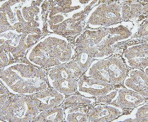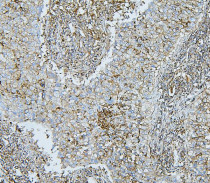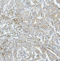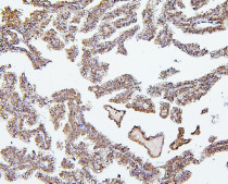 Immunohistochemistry: Paraffin-embedded Human lung cancer tissue. Antigen Retrieval: Heat mediation was performed in Citrate buffer (pH 6.0) for 20 min. The tissue section was blocked with 10% goat serum. The tissue section was then stained with ARG43268 anti-IQGAP1 antibody at 1 µg/ml dilution, overnight at 4°C.