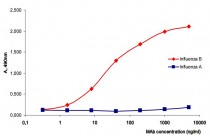 Indirect ELISA: Titration curves of ARG10634 anti-Influenza B group antigen antibody [InB114] specific to NP of Influenza B virus. Antigens: Influenza B: Influenza B/Tokyo/53/99 - 0.5 µg/well; Influenza A: mixture of two strains - A/Shangdong/9/93 and A/New Caledonia/20/99 - 0.5 µg/well.