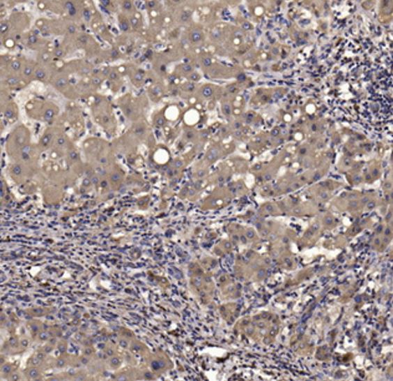 Immunohistochemistry: Human liver cancer stained with ARG67280 anti-JAK2 + JAK3 phospho (Tyr966 / Tyr939) antibody at 1:200 dilution.