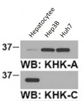 Western blot: Hepatocytee, Hep3B and Huh7 cell lysates stained with ARG66360 anti-KHK (isoform A) antibody (upper panel) and ARG66361 anti-KHK (isoform C) antibody (lower panel).