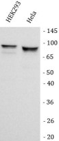 Western blot: HEK293 and Hela stained with ARG45650 anti-KHSRP antibody at 0.5 μg/ml dilution.