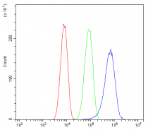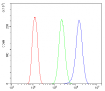 Flow Cytometry: SiHa cells were blocked with 10% normal goat serum and then stained with ARG43051 anti-KIF15 antibody (blue) at 1 µg/10^6 cells for 30 min at 20°C, followed by incubation with DyLight®488 labelled secondary antibody. Isotype control antibody (green) was rabbit IgG (1 µg/10^6 cells) used under the same conditions. Unlabelled sample (red) was also used as a control.
