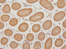 Immunohistochemistry: Paraffin-embedded Rat testis tissue. Antigen Retrieval: Heat mediation was performed in EDTA buffer (pH 8.0). The tissue section was blocked with 10% goat serum. The tissue section was then stained with ARG43051 anti-KIF15 antibody at 1 µg/ml dilution, overnight at 4°C.