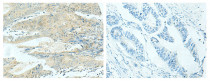 Immunohistochemistry: Paraffin-embedded Human colorectal cancer tissue stained with ARG43239 anti-KIF21B antibody (left) at 1:40 dilution, or the same antibody pre-incubated with synthetic peptide (right). (Original magnification: X200).