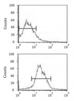 Flow Cytometry: MCF7 cells stained with ARG55815 anti-KLF4 antibody (bottom histogram) or without primary antibody control (top histogram), followed by incubation with PE labelled secondary antibody.