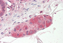 Immunohistochemistry: Paraffin-embedded Human small intestine tissue. Antigen Retrieval: Steam tissue section in Citrate buffer (pH 6.0). The tissue section was stained with ARG63222 anti-KLF8 / BKLF3 antibody at 3.75 µg/ml dilution followed by AP-staining.