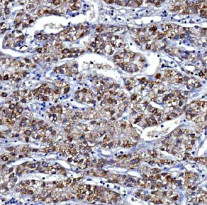 Immunohistochemistry: Human liver cancer stained with ARG45231 anti-KMO antibody at 2 μg/ml dilution.