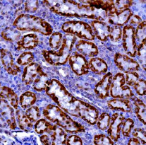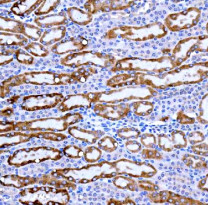Immunohistochemistry: Mouse kidney stained with ARG45231 anti-KMO antibody at 2 μg/ml dilution.