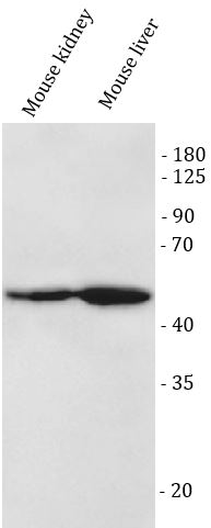 Western blot: Mouse kidney and mouse liver stained with ARG45231 anti-KMO antibody at 0.5 μg/ml dilution.