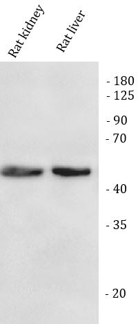 Western blot: Rat kidney and rat liver stained with ARG45231 anti-KMO antibody at 0.5 μg/ml dilution.