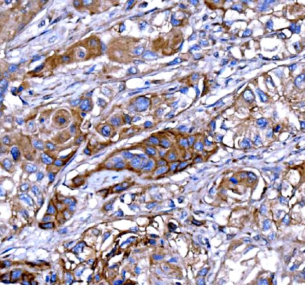 Immunohistochemistry: Human breast cancer stained with ARG45252 anti-Kindlin 2 antibody at 2 μg/ml dilution.