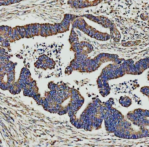 Immunohistochemistry: Human colorectal adenocarcinoma stained with ARG45465 anti-LARG antibody at 2 μg/ml dilution.