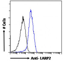 Flow Cytometry: Paraformaldehyde-fixed HepG2 cells permeabilized with 0.5% Triton. Cells were stained with ARG64222 anti-LARP2 antibody (blue line) at 10 µg/ml dilution and overnight, followed by incubation with Alexa FluorR 488 labelled secondary antibody. IgG control: Unimmunized goat IgG (black line).