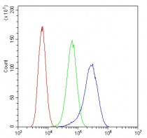 Flow Cytometry: U2OS cells were blocked with 10% normal goat serum and then stained with ARG40380 anti-LCP1 / Plastin L antibody (blue) at 1 µg/10^6 cells for 30 min at 20°C, followed by incubation with DyLight®488 labelled secondary antibody. Isotype control antibody (green) was rabbit IgG (1 µg/10^6 cells) used under the same conditions. Unlabelled sample (red) was also used as a control.