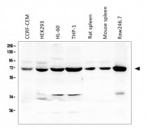 Western blot: 50 µg of samples under reducing conditions. Human CCRF-CEM, HEK293, HL-60, THP-1, Rat spleen, Mouse spleen and Raw246.7 cell lysates stained with ARG40380 anti-LCP1 / Plastin L antibody at 0.5 µg/ml, overnight at 4°C.