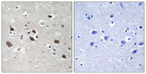 Immunohistochemistry: Paraffin-embedded Human brain stained with ARG66537 anti-LCP2 / SLP76 phospho (Tyr128) antibody. The picture on the right is blocked with the phospho peptide.