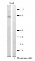 Western blot: K562 cells treated with Na3VO4 (0.3 nM for 40 min) and stained with ARG66537 anti-LCP2 / SLP76 phospho (Tyr128) antibody. The lane on the right is blocked with the phospho peptide.