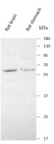 Western blot: Rat brain and Rat stomach stained with ARG44401 anti-LGI4 antibody at 0.5 μg/mL dilution.