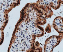 Immunohistochemistry: Formaldehyde-fixed and paraffin-embedded Human placenta tissue. Antigen Retrieval: Heat mediation was performed in EDTA buffer (pH 9.0). Samples were stained with ARG41857 anti-LIN28B antibody at 1:500 dilution for 1 hour at RT.