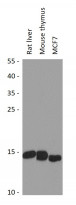 Western blot: 25 µg of Rat liver, Mouse thymus and MCF7 cell lysates stained with ARG59927 anti-LSM4 antibody at 1:1000 dilution.