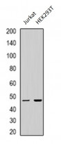 Western blot: Jurkat and HEK293T whole cell lysates stained with ARG66460 anti-LUC7L2 antibody.