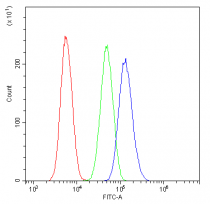 Flow Cytometry: SiHa cells were blocked with 10% normal goat serum and then stained with ARG41413 anti-Lactoferrin antibody (blue) at 1 µg/10^6 cells for 30 min at 20°C, followed by incubation with DyLight®488 labelled secondary antibody. Isotype control antibody (green) was Rabbit IgG (1 µg/10^6 cells) used under the same conditions. Unlabelled sample (red) was also used as a control.