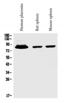 Western blot: 50 µg of samples under reducing conditions. Human placenta, Rat spleen and Mouse spleen lysates stained with ARG41413 anti-Lactoferrin antibody at 0.5 µg/ml dilution, overnight at 4°C.