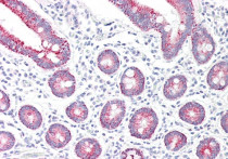 Immunohistochemistry: Paraffin-embedded Human small intestine tissue. Antigen Retrieval: Steam tissue section in Citrate buffer (pH 6.0). The tissue section was stained with ARG63853 anti-MAOA antibody at 5 µg/ml dilution followed by AP-staining.