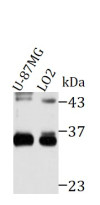 Western blot: U-87MG and LO2 cell lysates were stained with ARG43642 anti-MAPRE1 / EB1 antibody at 1:10000 dilution, overnight at 4°C.