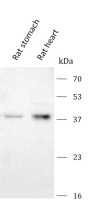 Western blot: Rat stomach and Rat heart stained with ARG44121 anti-MECR antibody at 0.5 μg/ml dilution.