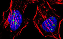 Immunofluorescence: HeLa cells were fixed with 4% PFA (20 min), permeabilized with Triton X-100 (0.1%, 10 min), then stained with ARG41159 anti-MEOX1 / MOX1 antibody (green) at 1:25 dilution, 1 hour at 37°C. Cytoplasmic actin was counterstained with Alexa Fluor® 555 (red) conjugated Phalloidin (7 units/ml, 1 hour at 37°C). DAPI (blue) for nuclear staining.