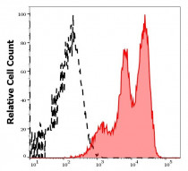 Flow Cytometry: Separation of stained bovine lymphocytes (red-filled) from unstained bovine lymphocytes (black-dashed). Cells were stained with ARG42463 anti-MHC Class I (alpha + beta2m chains) antibody [IVA26] at 10 µg/ml dilution, followed by APC-conjugated Goat anti-Mouse antibody.