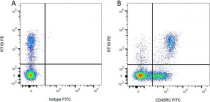 Flow Cytometry: Figure A. anti-Rat CD45RC (FITC) and Mouse IgG1 isotype control (PE). Figure B. anti-Rat CD45RC (FITC) and ARG22773 anti-MHC Class II RT1B antibody [OX-6] (PE). All experiments performed on red cell lysed Rat blood gated on mononuclear cells.