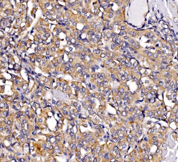 Immunohistochemistry: Human thyroid papillary carcinoma stained with ARG45579 anti-MIRO1 antibody at 2 μg/ml dilution.