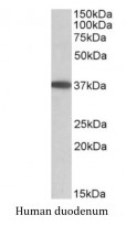 Western blot: 35 µg of Human duodenum lysate (in RIPA buffer) stained with ARG42173 anti-MOGAT2 antibody at 0.05 µg/ml dilution and incubated at RT for 1 hour.