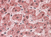 Immunohistochemistry: Paraffin-embedded Human liver tissue. Antigen Retrieval: Steam tissue section in Citrate buffer (pH 6.0). The tissue section was stained with ARG42225 anti-MPV17 antibody at 5 µg/ml dilution followed by AP-staining.
