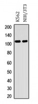 Western blot: K562 and NIH/3T3 whole cell lysates stained with ARG66553 anti-MYBL2 / B MYB antibody.