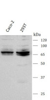 Western blot: Caco-2 and 293T stained with ARG44211 anti-MYNN antibody at 0.5 μg/mL dilution.