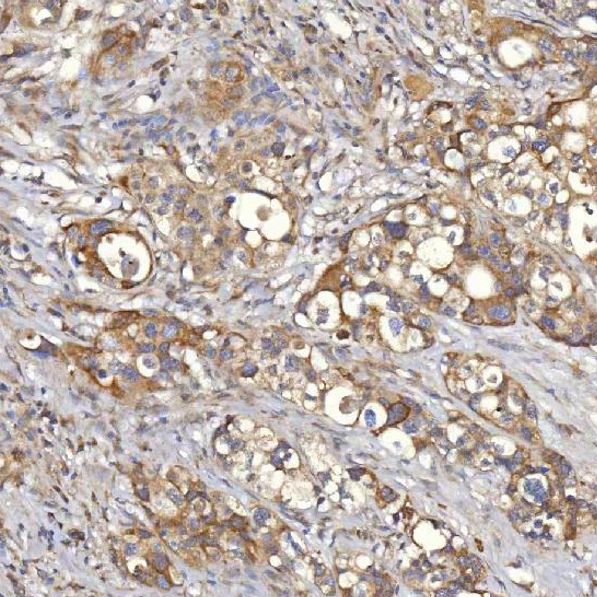 Immunohistochemistry: Human appendix adenocarcinoma stained with ARG45538 anti-Mitochondrial dicarboxylate carrier antibody at 2 μg/ml dilution.