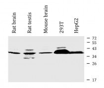 Western blot: 50 µg of samples under reducing conditions. Rat brain, Rat testis, Mouse brain, 293T and HepG2 whole cell lysates stained with ARG41352 anti-Musashi 1 antibody at 0.5 µg/ml dilution, overnight at 4°C.