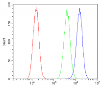 Flow Cytometry: A549 cells were blocked with 10% normal goat serum and then stained with ARG41275 anti-MyD88 antibody (blue) at 1 µg/10^6 cells for 30 min at 20°C, followed by incubation with DyLight®488 labelled secondary antibody. Isotype control antibody (green) was rabbit IgG (1 µg/10^6 cells) used under the same conditions. Unlabelled sample (red) was also used as a control.