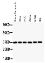 Western blot: 50 µg of samples under reducing conditions. Rat cardiac muscle, HeLa, MCF7, HepG2, Jurkat and Raji whole cell lysates stained with ARG41275 anti-MyD88 antibody at 0.5 µg/ml dilution, overnight at 4°C.