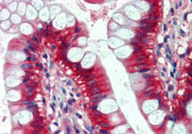 Immunohistochemistry: Paraffin-embedded Human small Intestine tissue. Antigen Retrieval: Steam tissue section in Citrate buffer (pH 6.0). The tissue section was stained with ARG64621 anti-N-Ras antibody at 2.5 µg/ml dilution followed by AP-staining.