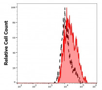 Flow Cytometry: Separation of stained HUVEC cells (red-filled) from unstained HUVEC cells (black-dashed). Cells were stained with ARG42188 anti-N-sulfated heparan sulfate antibody [HepSS-1] at 9 µg/ml dilution, followed by APC-conjugated Goat anti-Mouse antibody.