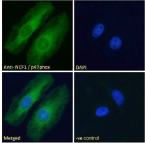 Immunofluorescence: Paraformaldehyde fixed HeLa cells permeabilized with 0.15% Triton. Cells were stained with ARG63148 anti-NCF1 / p47phox antibody (green) at 10 µg/ml dilution for 1 hour. DAPI (blue) for nuclear staining. Negative control: Unimmunized goat IgG (green) at 10 µg/ml dilution.