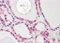 Immunohistochemistry: Paraffin-embedded Human thyroid tissue. Antigen Retrieval: Steam tissue section in Citrate buffer (pH 6.0). The tissue section was stained with ARG41721 anti-NEK7 antibody at 3.75 µg/ml dilution.