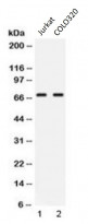 Western blot: 1) Jurkat and 2) COLO320 cell lysates stained with ARG23706 anti-NFIA antibody at 0.5 µg/ml dilution.