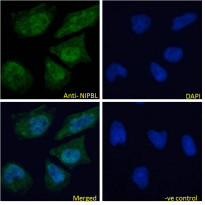 Immunofluorescence: Paraformaldehyde fixed HeLa cells permeabilized with 0.15% Triton. Cells were stained with ARG65235 anti-NIPBL antibody (green) at 10 µg/ml dilution for 1 hour. DAPI (blue) for nuclear staining. Negative control: Unimmunized goat IgG (green) at 10 µg/ml dilution.